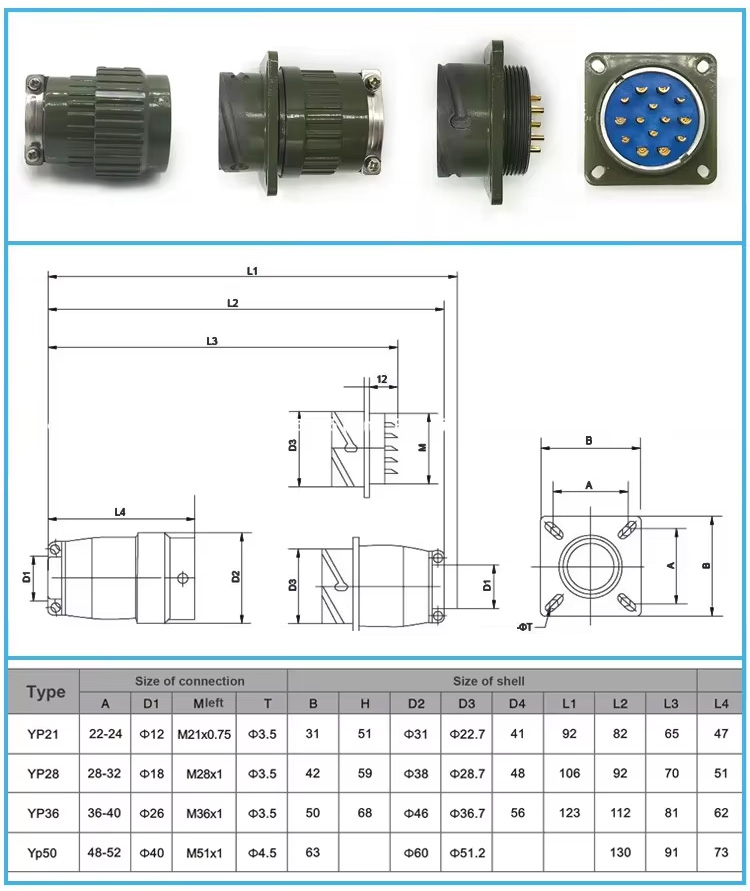 · Flexible configurations: 2-120 pin options, 4 models (YP21/28/36/50) with 1mm-5mm pin diameters, flange/cable connection types, female&male genders.